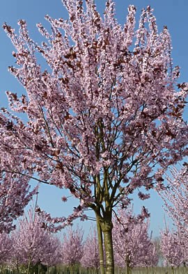 Croissance modérée, couronne arrondie. Rameaux rouge sombre, feuillage pourpre foncé d’avril à novembre. Belles fleurs simples d’un rose lumineux. Se plait en sols ordinaires. A utiliser en isolé, en groupe ou en alignement.
