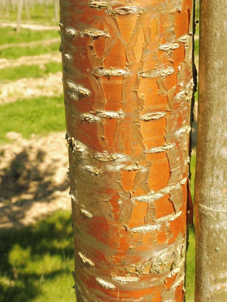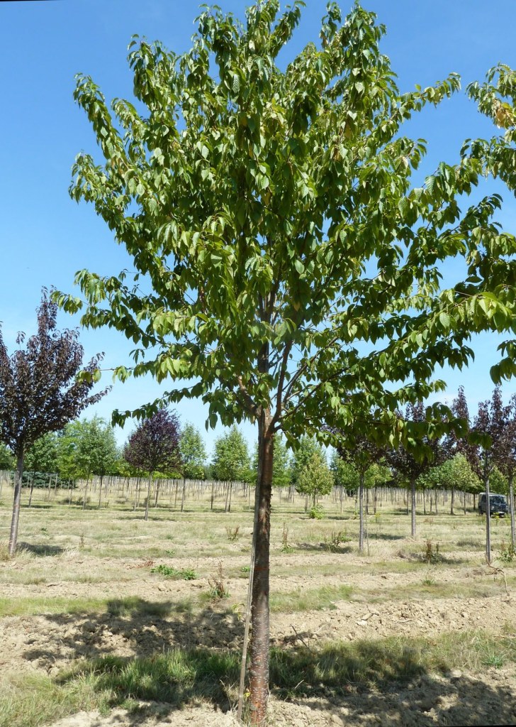 Cime arrondie de bonne vigueur. Rameaux d’une brillante couleur bien dorée pelant horizontalement. Grandes feuilles vert clair devenant jaune intense à l’automne. Fleurs blanches en avril. Préfère les sols profonds.